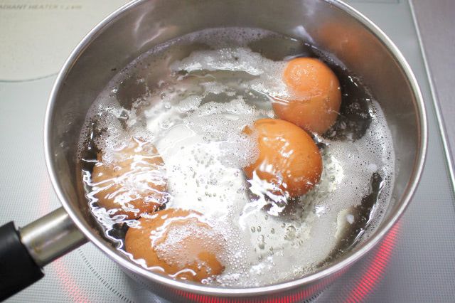 「ミモザサラダ」は、表面にゆで卵の卵黄を散らすので、固茹でになるまで茹でます。お湯(分量外)が沸騰してから、卵を13分ほど茹でました。