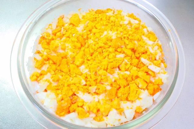 5段目はゆで卵の黄身。ミモザの花に見立てて、まんべんなく乗せます。