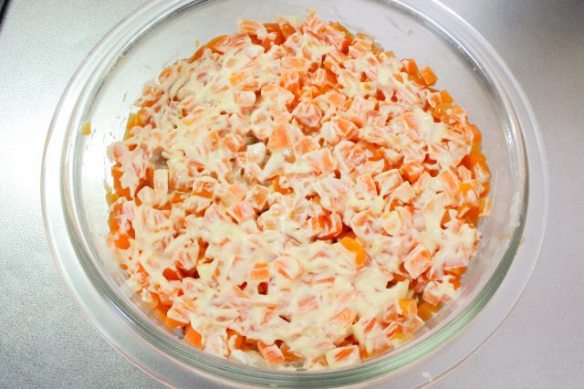 3段目は刻んだにんじん。にんじんはポロポロと崩れやすいので、マヨネーズを多めに塗るのがおすすめです。