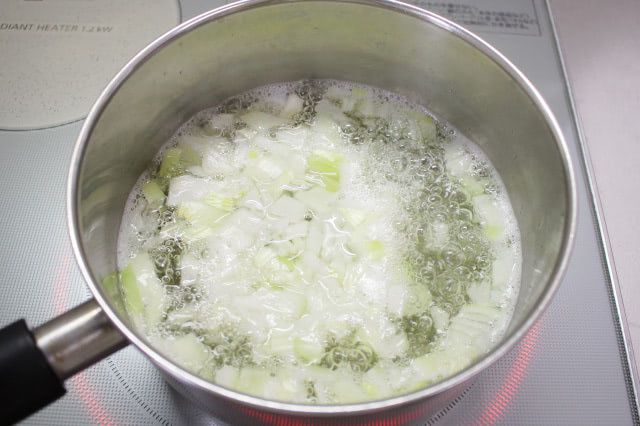 玉ねぎをサッと茹でて辛味を抜きつつ、シャキシャキとした食感を残します。20秒ほど茹でてザルに上げ、しっかりと水気を切り、冷ましておきました。