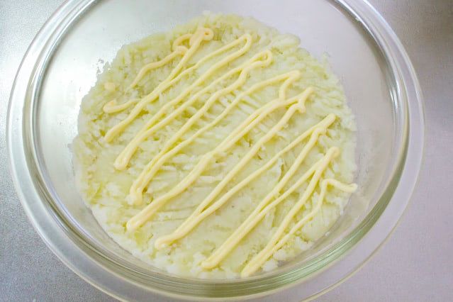 一番下にじゃがいもを敷き、マヨネーズをかけて塗り広げます。