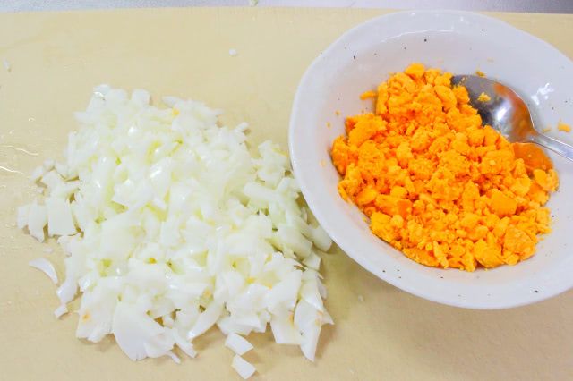 5. 2の固ゆで卵を白身と黄身に分け、白身をみじん切りに、黄身を細かくほぐします。