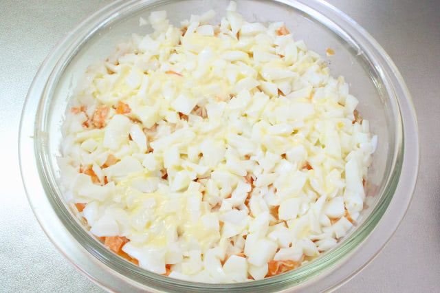 4段目はゆで卵の白身。最後に卵黄をトッピングするので、接着材代わりに、マヨネーズをたっぷりめにかけるのがおすすめです。