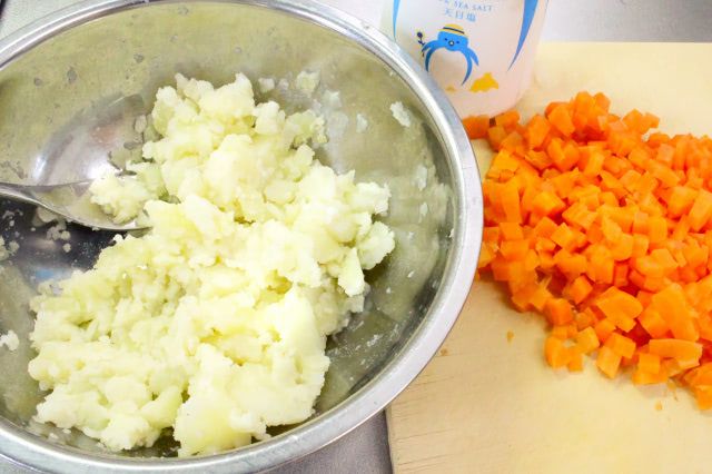 今回、じゃがいもは粒が残る程度に潰しましたが、なめらかに潰しても構わないと思います。にんじんは出来るだけ細かく切った方が、仕上がりが美しくなりますよ。