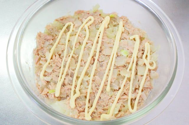 2段目はツナオニオンを敷き、マヨネーズをかけて塗り広げます。