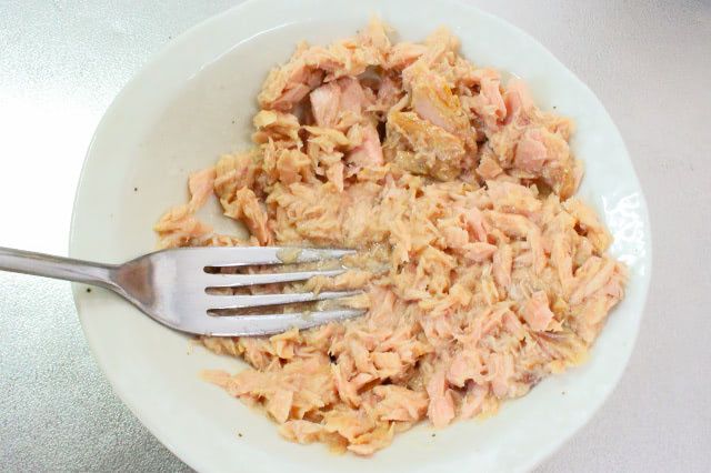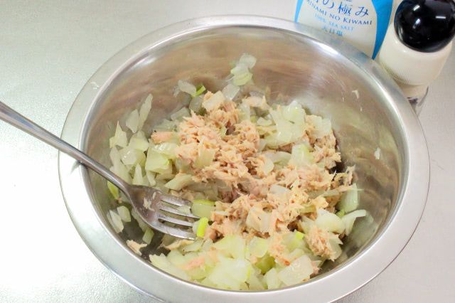 4. ツナの油を切って、大きな塊がなくなるようにフォークでほぐします。3と混ぜ合わせ、塩と黒こしょうで味付けします。