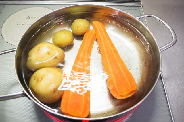1. 鍋に、きれいに洗ったじゃがいもと、縦半分に切ったにんじんを、皮を剥かずに入れます。野菜がかぶるくらいの量の水(分量外)を注ぎ、中火で沸騰させてから弱火にして、30~40分茹でます。