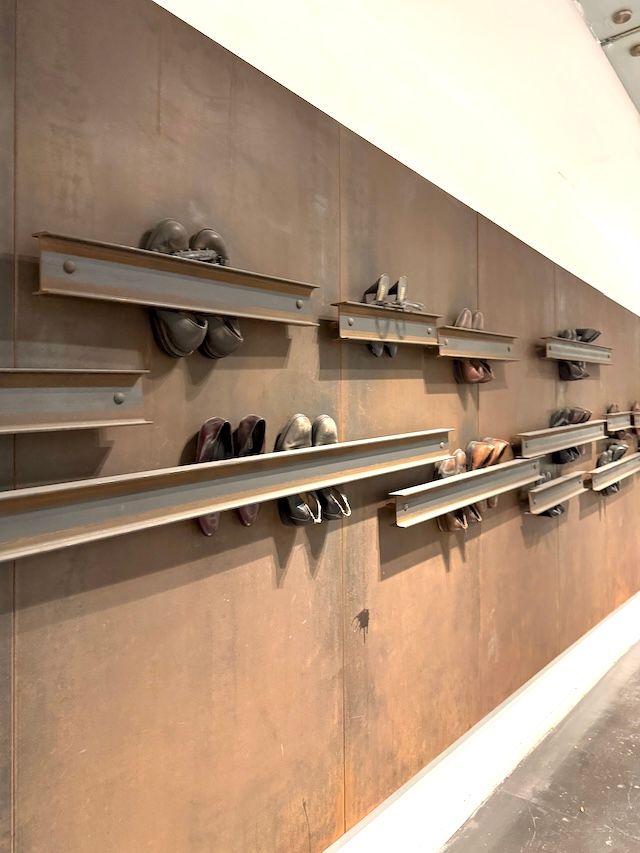 エスカレーターの踊り場には鋳鉄に靴や古着をはさんだものが。これもアート! Jannis Kounellis(ヤニス・クネリス)の作品です。