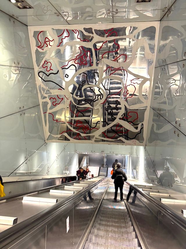 これは、イタリアの中世の詩人ダンテの作品から引用した文章を使ったダンテ駅の電光アート。駅を抜けた地上にはダンテ像があり、地上と地下で一貫した文化的体験ができるのも面白いポイントです。