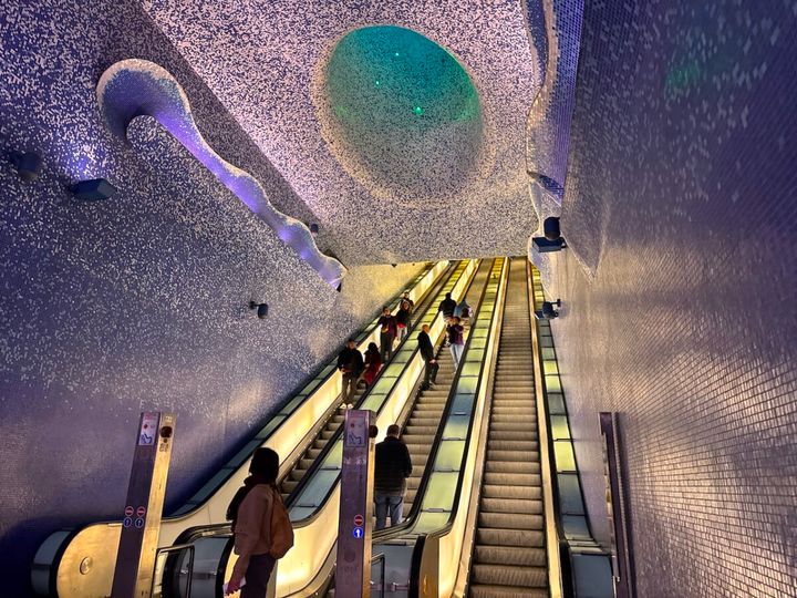 その名の通り大学エリアに位置するウニヴェルシタ駅は、ポップで鮮やかな色使いが特徴。情報社会や言語、知識といったテーマを扱っており、ネオンカラーのインスタレーションや彫刻が未来的な雰囲気を演出します。