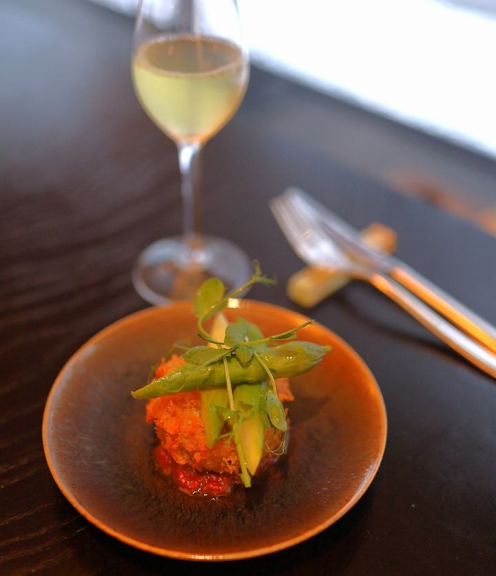 モリーユ茸のクロケット グリーンアスパラガス。「一保堂茶舗 京都」の水出し玉露とともに。