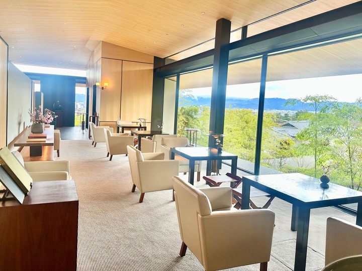 「山荘 京大和」にある四季折々の庭園を一望できるラウンジ。時間帯によって趣が変わるのも素敵。