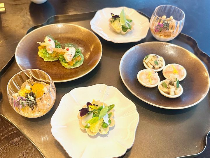 アソートセイボリー(春野菜のタルト、帆立貝のタルタル 筍 蕗の薹、サーモン そら豆 菜の花、新玉ねぎのムース キャビア)に、「カモミール アートオブティー 石川」を合わせて。