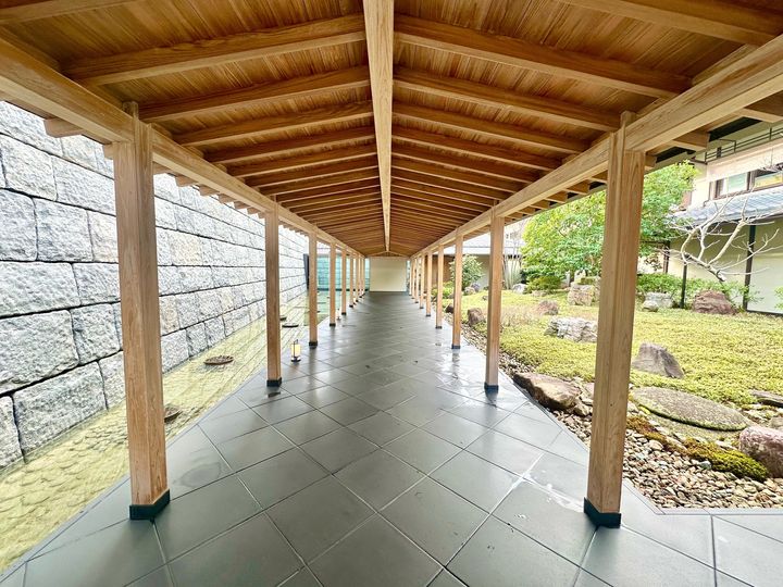 厳かな門をくぐるとアライバルハウスまで風情ある廊下が出現。右手には、京都の庭園に3億年以上前のアメリカの古代石を配した「プリツカ―庭園(叡心庭)」があります。