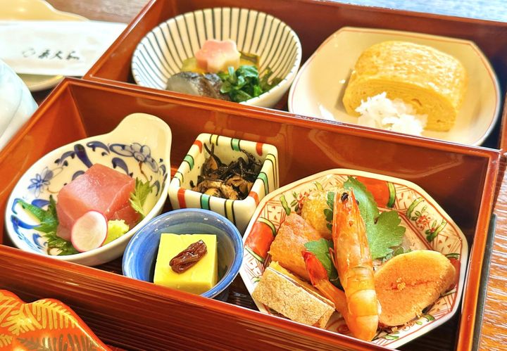 彩り豊かな2段重が目を惹く華やかな朝食が登場!左上の釜で炊いたご飯は、ふっくらツヤツヤ。朝から贅沢な品揃えに気分が上がります。