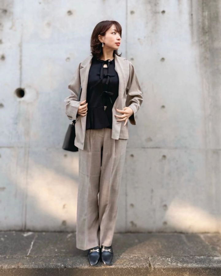 最初に紹介するのは、大きなリボンが正面に3つあるデザインの「フロントリボンセーター」。SNSでも大人気のアイテムです♪フロント部分はオープンスタイルで、インナー次第でさまざまなコーデを楽しめます。@sanaekakeiさんは、フロントリボンセーターにかっちりめのセットアップを合わせた甘辛コーデにトライ!大人かわいい組み合わせです♡