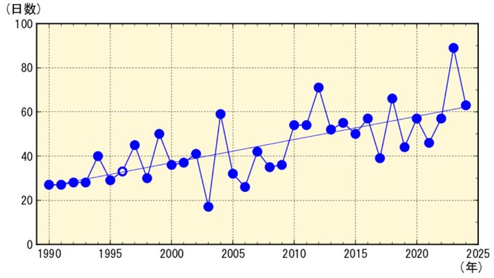 「つくばの日最大UVインデックスが8以上の年積算日数の経年変化」