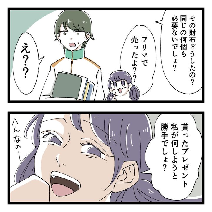 「その財布どうしたの?同じの何個も必要ないでしょ?」先生の言葉に、「フリマで売ったよ??」と即答。「え??」驚く先生に、「貰ったプレゼント、私が何しようと勝手でしょ?へんなのー」と笑いながら答える女子生徒に、