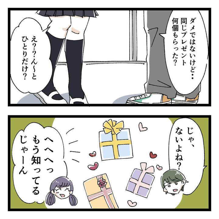 その後、女子生徒に確認した先生は、何を言っても「先生どこから聞いたの?」「誕生日プレゼントもらうのってダメなこと?」と笑いながら言い、最終的に3人の男子生徒から同じ財布をもらったことが判明。「同じの何個も必要ないでしょ?」と先生が言うと、「フリマで売ったよ?もらったプレゼント、私が何しようと勝手でしょ?」と開き直り、「プレゼントしてくれた人の中から付き合ったよ?」と無邪気に笑いながら答えるのでした。
