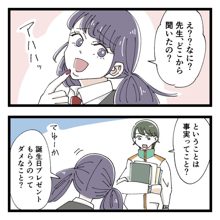 「え??なに?先生、どこから聞いたの?」笑いながら女子生徒が答えました。「ということは事実ってこと?」先生が冷静にたずねると、「てゆーか、誕生日プレゼントもらうのってダメなこと?」と全く悪びれもせずに答えます。