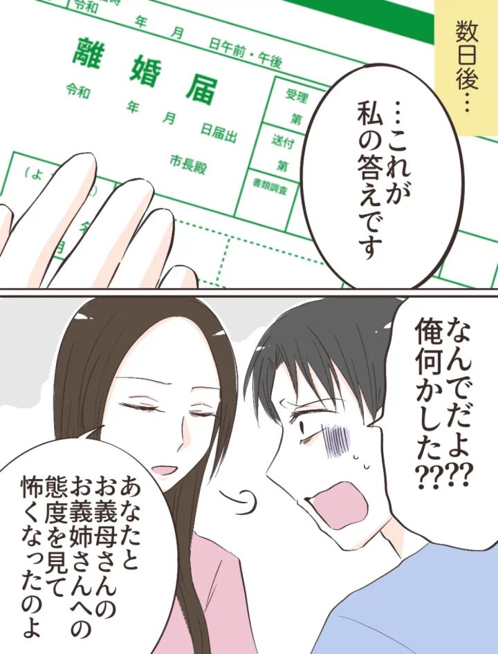 「なんでだよ??俺何かした??」驚くカズキさんに、「あなたとお義母さんの、お義姉さんへの態度を見て怖くなったのよ」と答えた奥さん。