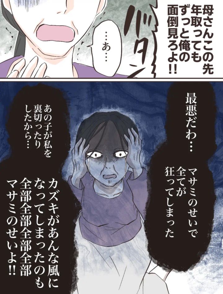 「母さん、この先年取ってもずっと俺の面倒見ろよ!!」そう言い捨てると出て行ってしまったカズキさん。お母さんは「・・あ・・最悪だわ・・マサミのせいで全てが狂ってしまった。あの子が私を裏切ったりしたから・・カズキがあんな風になってしまったのも全部全部全部全部マサミのせいよ!!」