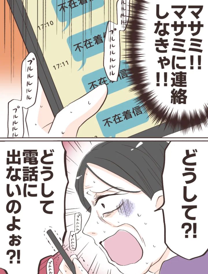 「マサミ!!マサミに連絡しなきゃ!!」そう言ってマサミさんに電話をかけ続けるお母さん。「どうして!?どうして電話に出ないのよぉ!?」と電話に向かって叫びました。
