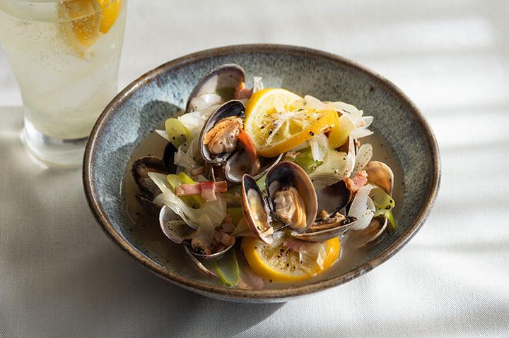 【きじま】あさり×豚肉は、個人的に鉄板のコンビ。和洋中を問わず、いろいろな料理に使うけど、あさりの酒蒸しなら豚肉よりもベーコンが合わせやすい。ここにレモンを足すと、一気に華やかな風味が加わって家飲みつまみの主役になる。