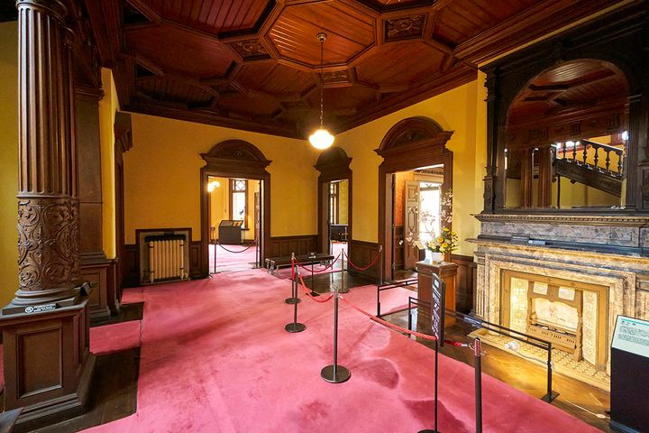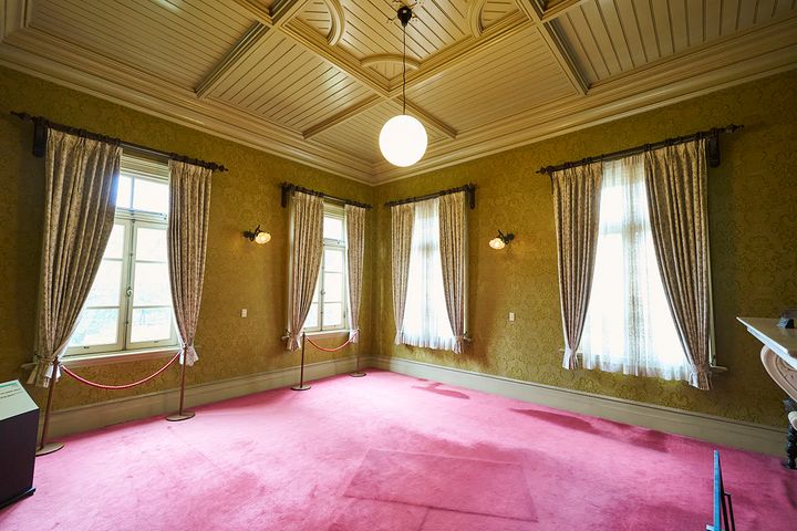 次は、客室や集会室がある2階へ。壁紙に使われているのは、岩崎邸のシンボルでもある伝統工芸品の金唐革紙(きんからかわし)。「旧岩崎邸庭園」では部屋ごとに色味やデザインの趣がすべて異なります。現在はじゅうたんが敷かれているため見えないですが、床の寄木も各部屋によってデザインが異なっていたとか。各部屋の壁にあしらわれている金唐革紙などの壁紙も部屋によって雰囲気が違うので、ぜひ注目してみてください。