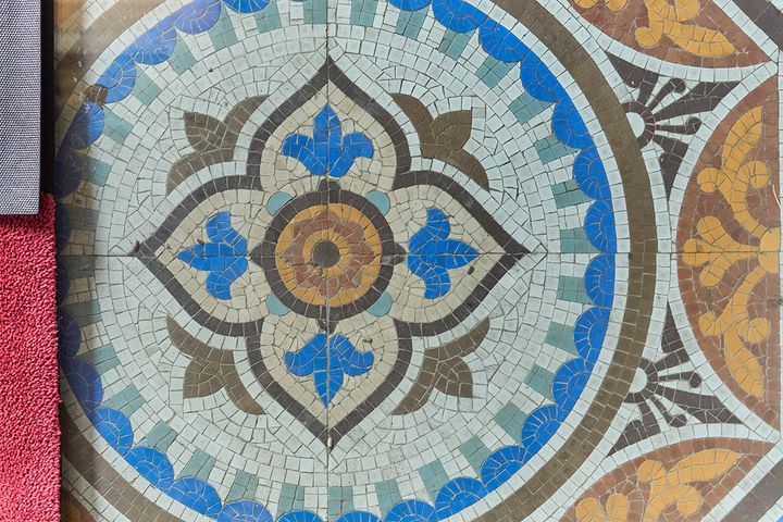 正面玄関の床に敷かれているタイルにも注目です。目地がなく、繊細な美しさ。美しいタイルが玄関以外にもベランダの床や暖炉周辺など、館内の随所に使用されています。