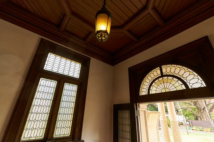 重厚な木製の扉の上部にあしらわれた、正面玄関のステンドグラスもみどころ。これも建物の設計を手がけたジョサイア・コンドルによるもの。庭園の緑を映し出せるように、ステンドグラスによく見られる鮮やかな色彩をあえて付けていないそうです。