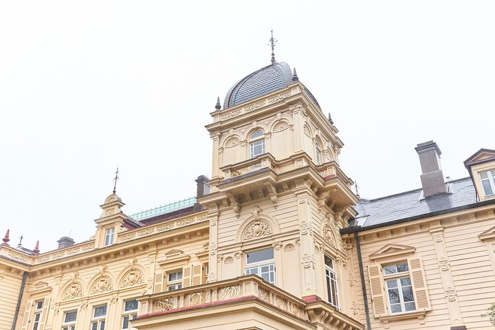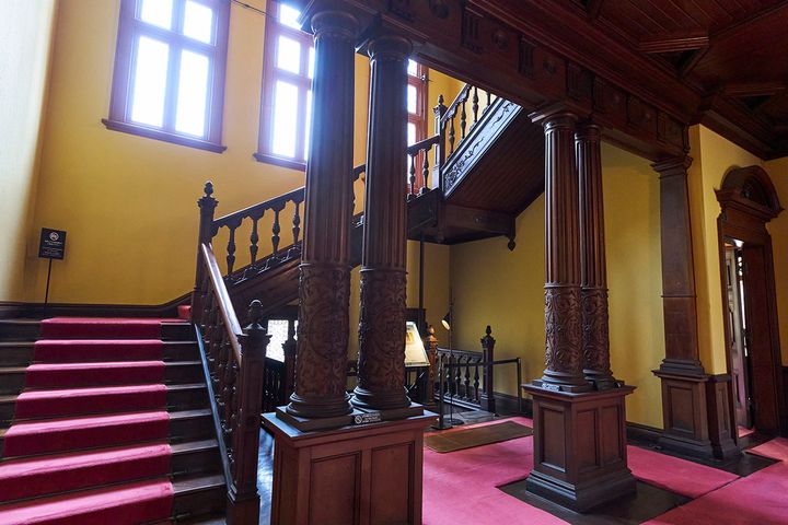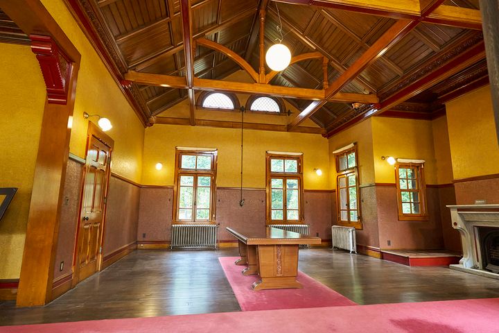 こちらが、撞球室。中に入ることはできませんが、外から眺めることは可能。当時はここで男性たちがビリヤードをして楽しみました。開放的な天井からは、また洋館とも違った、洗練された趣が感じられます。