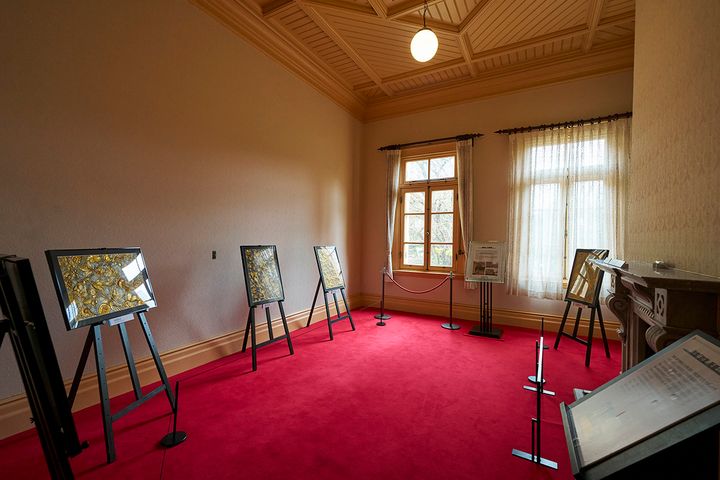 2階には、2025年の3月に公開されたばかりの部屋があります。ここでは、金唐革紙の作品が展示されています。この部屋の窓からは、庭園の大きなイチョウの木がよく見え、黄葉の際に一番いい眺めが期待できるスポットだそうですよ。