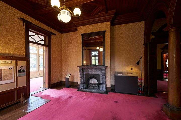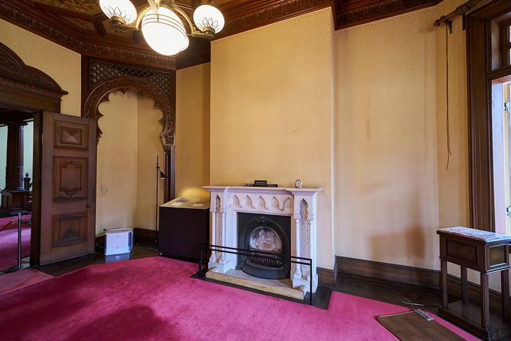こちらが、洋館1階の婦人客室。設計者であるコンドルが好んでいたという、イスラム風のデザインが取り入れられており、暖炉のデザインもイスラム風です。当時、社交界では食事前後などに男性女性が分かれて過ごす文化があったため、男性は撞球室で、女性はこの部屋でくつろいで過ごしたとか。