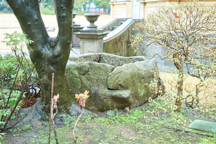 馬車道を5分ほど歩くと、「旧岩崎邸庭園」が見えてきました! 手前に広がる木々もみどころです。夏の新緑、秋の紅葉と、四季折々でさまざまな表情を楽しめます。樹齢400年以上という立派なイチョウの木もあり、秋に美しい姿を見せてくれます。