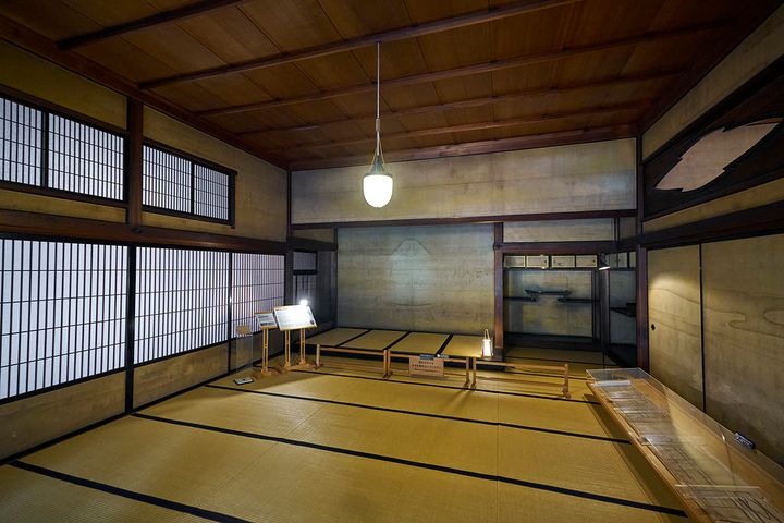 お茶をした後は、和館を少し見学しましょう。完成当時は、洋館よりも和館のほうがはるかに広かったそうですが、現在では取り壊しを経て一部のみが残っています。部屋の各所には三菱財閥のシンボルである「菱紋(ひしもん)」がモチーフとなったしつらえが見られ、ふすまには富士山の絵も見られます。部材のひとつひとつは、現在では入手困難な木材。当時の様子そのままを、じっくり観察しましょう。