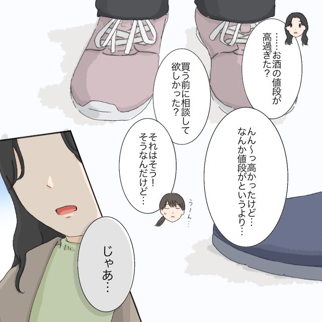 みや子さんに「お酒の値段が高すぎた?」と聞かれましたが、なんか違う。そこにイライラしたのではない気がします。「高かったけど、なんか値段がというより・・・」なんだろう。確かに1万円には驚いたけれど。「買う前に相談して欲しかった?」みや子さんの質問に「それはそう!そうなんだけど・・・」相談してくれてさえいればイライラしなかったのかな。それともやっぱり少し違う気がしました。何だろう、このイライラは。上手く説明できずに悩んでいると、「じゃあ」とみや子さんはまた私に聞きました。