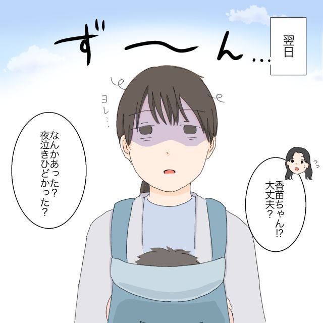 久しぶりに激しい感情を出したら興奮したせいなのか、沙苗の夜泣きのせいか、私はほとんど眠れずに朝を迎えました。寝不足で泣きはらして酷い顔のうえ、気持ちも落ち込みつつ、いつもの早朝散歩に出かけた私に、みや子さんが「香苗ちゃん!?大丈夫?」と声をかけてくれました。相当ひどい顔なのか、「なんかあった?夜泣き酷かった?」本気で心配そうにしてくれたみや子さんです。