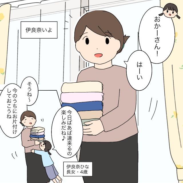ひなは、嬉しそうに私に飛びつきながら、「今日ばぁばたちが来るの楽しみだね」とウキウキです。「そうね~、今のうちにお片付けしておこうね」