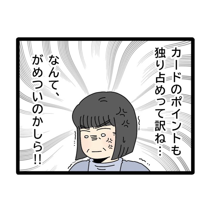 「カードのポイントも独り占めって訳ね・・なんてがめついのかしら!!」そう思い、怒りで方を震わせるのでした。