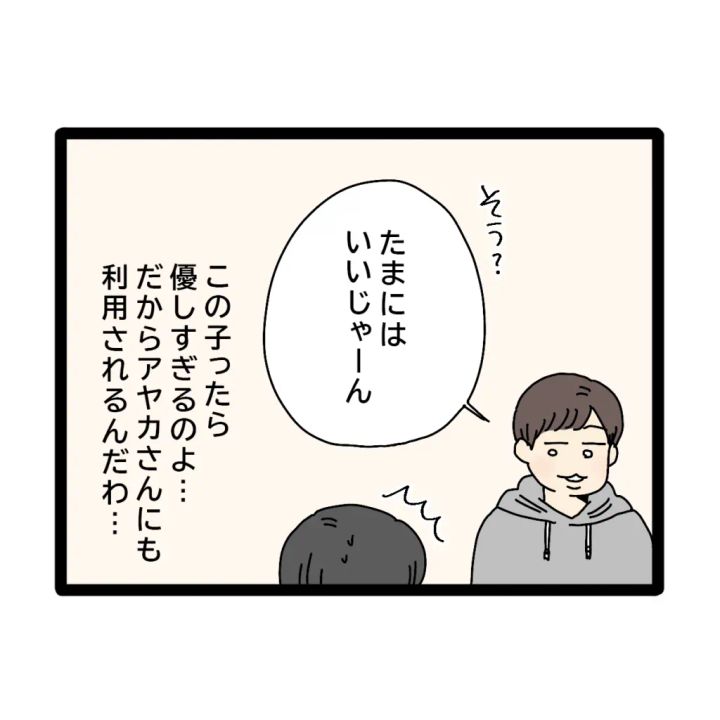 贅沢しすぎだと義母に言われたアヤカさん。すると、「そう?たまにはいいじゃーん」とコウタさん。「この子ったら優しすぎるのよ・・だからアヤカさんにも利用されるんだわ・・」と心配する義母が、