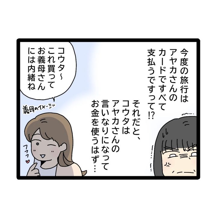 アヤカさんと結婚する前からコウタさんのお金を管理してきた義母は、夫婦で行くという旅行の代金は、コウタさんのカードで全て支払うようにと伝え、後日利用明細を確認し、あまりの高額請求にビックリ!旅行代金を折半した金額を封筒に書いてアヤカさんに渡した義母は、歯切れの悪い返事をするアヤカさんに、「しっかり釘をさしておかないと!!」と気合いを入れ、その後、あなたたちには旅館が高級すぎただの、食事代もかかりすぎだのと次から次へと文句を言い、そう言われたアヤカさんは、「え・・」と驚くのでした。