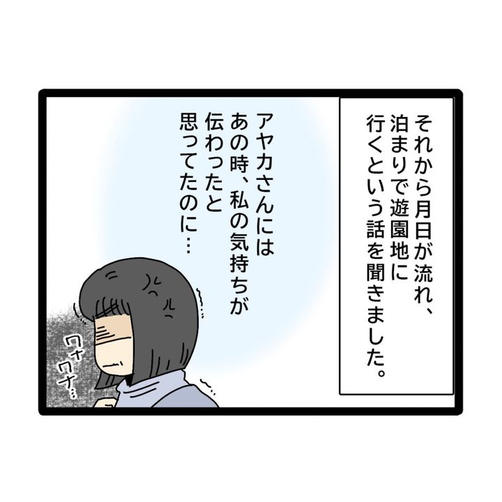 それから月日が流れ、泊まりで遊園地に行くという話をコウタさんから聞いた義母は、「アヤカさんにはあの時、私の気持ちが伝わったと思ってたのに・・」とワナワナと震え、