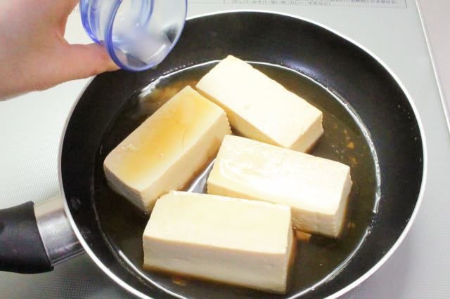 フライパンにオイスターソース、酒、水を入れて、オイスターソースを溶かします。中火で沸騰させてから、豆腐をそっと入れました。