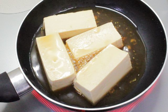 時々、豆腐に煮汁をかけて、まんべんなく味が染みるように煮るのがポイントとのこと。ですが、今回は豆腐の半分くらいしか煮汁に浸らなかったので、数回ひっくり返しながら、フタをして煮ました。