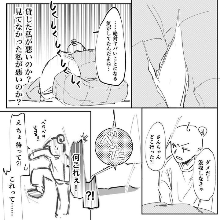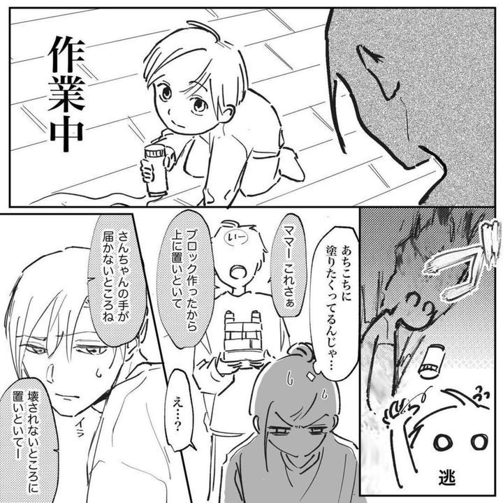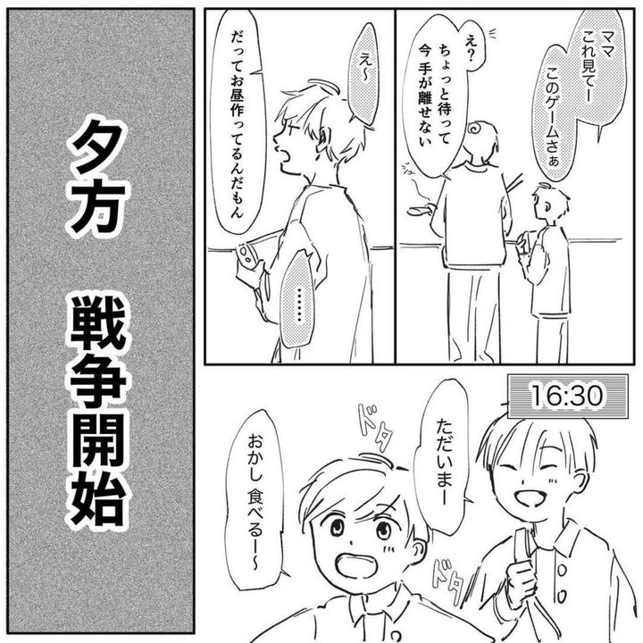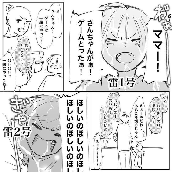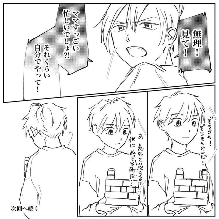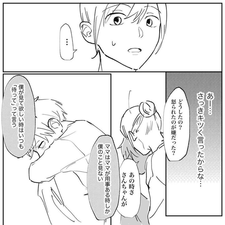 そしてつい、長男のいーくんには、強い口調で「それくらい自分でやって」と言ってしまいました。さみしそうにその場から立ち去る いーくんの後ろ姿が切ないですね。