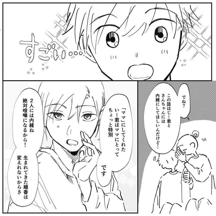 長男・いーくん、次男・じーくん、三男・さんちゃんの子育てに日々追われている、ちか*三兄弟の母さん。次男と三男はまだまだ手がかかる年ごろです。そのため、つい長男にはガマンさせてしまうことが多くて…。3兄弟とのドタバタな日常の中、いちばん上の子に対する接し方に悩んだ体験談。ちか*三兄弟の母(@chi_ka_mam)さんの描く、『一番さいしょに生まれた僕』をダイジェスト版でごらんください。