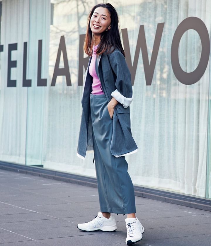 ハイテクスニーカーにビッグジャケットをラフに羽織ってニューヨーカーの通勤スタイルっぽく。血色感を上げるピンクのTシャツとタイトスカートが程よい女っぽさをプラス。