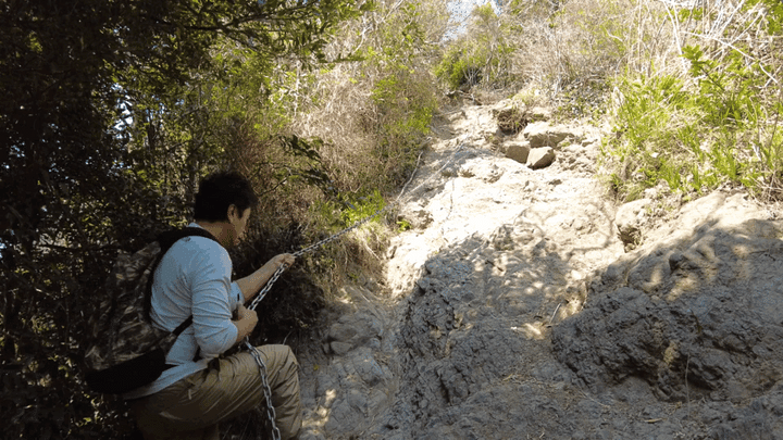 初心者も楽しめる低山ではあるものの、到着した鎖場の様子を見た原田さん、少し慎重になります。