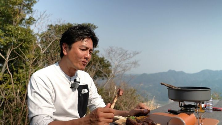 千葉県では鹿や猪などによる農作物の被害が拡大し続けていて、捕獲した野生鳥獣をジビエとして消費する取り組みを進めているのだといいます。ということで、今回の「頂きメシ」は野生鹿肉のステーキ!ジビエ料理は火の通り具合に注意して焼き上げていきます。仕上げは地元の特産を生かしたびわバターをソースにして、おいしそうに完成しました!道中で作ったお手製の箸とフォークも大活躍。 ワイルドなキャラクターの原田さんにピッタリな頂きメシに大満足、お疲れ様でした!